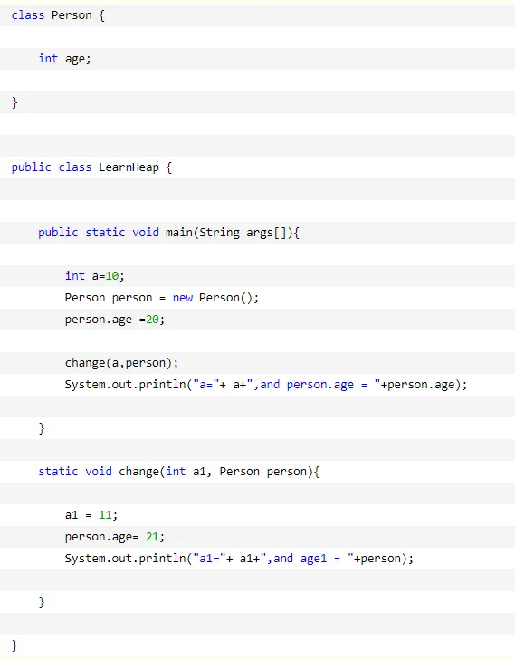 第4步 —— change()执行完毕,变量a立即释放,空间消失。但是main()函数空间仍存在,main中的变量a仍然存在,不受影响。而person在堆中对应的地址,所指的age已经赋值=21。