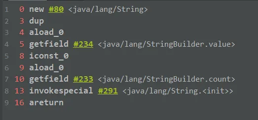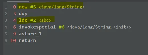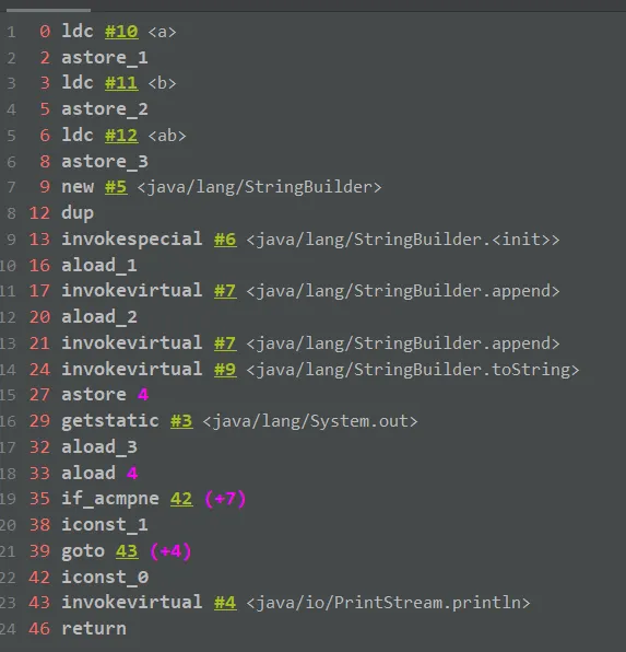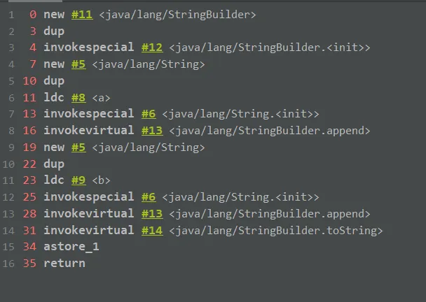 }但是,我们通过字节码指令查看toString()方法,发现并没有将 ab 这个字符串放到字符串常量池(区别于直接new String("ab"))