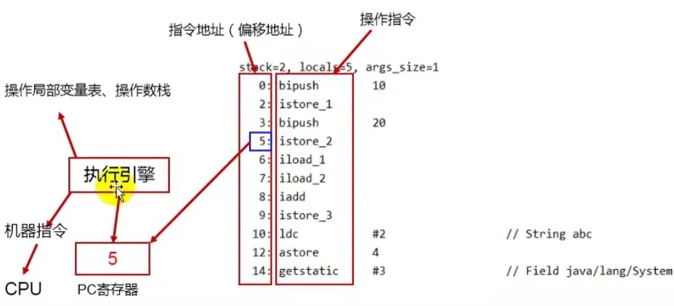 执行引擎通过PC寄存器存储的下一条指令的地址,知道了该地址相应的操作指令,接着执行引擎跟着操作指令操作局部变量表、操作数栈(赋值或者运算等),并翻译成机器指令给CPU运行。