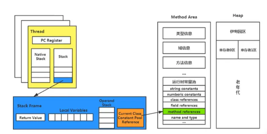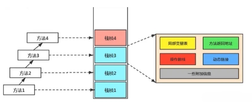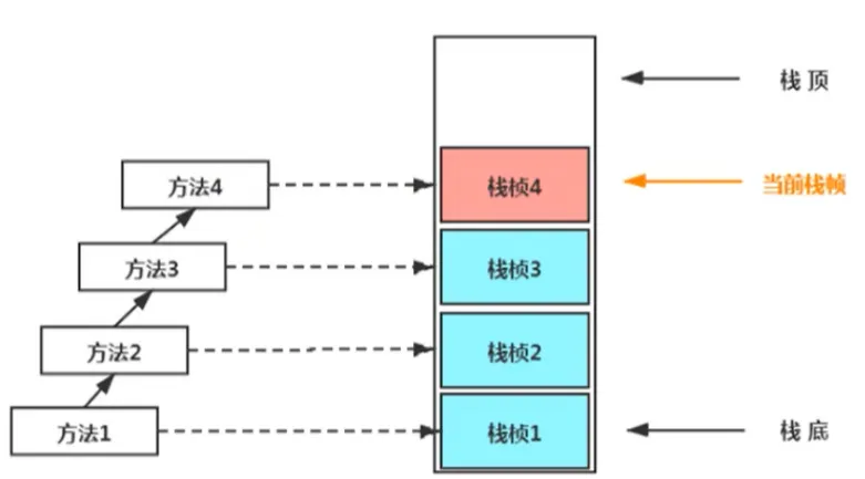 如果在该方法中调用了其他方法,对应的新的栈帧会被创建出来,放在栈的顶端,成为新的当前帧。