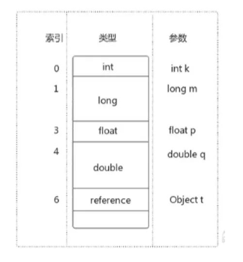 • 在局部变量表里,32位以内的类型只占用一个slot(包括returnAddress类型),64位的类型(long和double)占用两个slot。