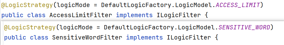 List<ILogicFilter> logicFilters会被Spring自动收集。也就是说,Spring会将容器中所有实现了ILogicFilter接口的Bean注入到这个列表中。即我们实现的AccessLimitFilter和SensitiveWordFilter