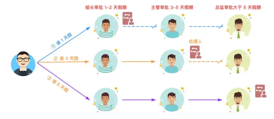 在公司中不同的岗位拥有不同的职责与权限。以上述的请假流程为例,当请 1 天假时,只要组长审批就可以了,不需要流转到主管和总监。如果职责链上的某个环节无法处理当前的请求,若含有下个环节,则会把请求转交给下个环节来处理。