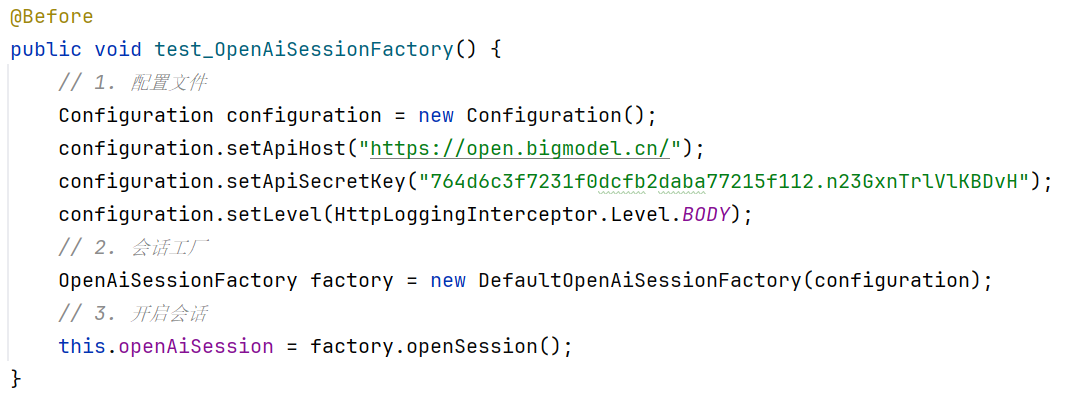 该方法封装了 HTTP 客户端的创建、日志拦截器的配置、Retrofit 实例的构建等细节,调用者只需关心通过工厂获取一个OpenAiSession实例,而无需了解内部复杂的初始化逻辑。解耦和易扩展