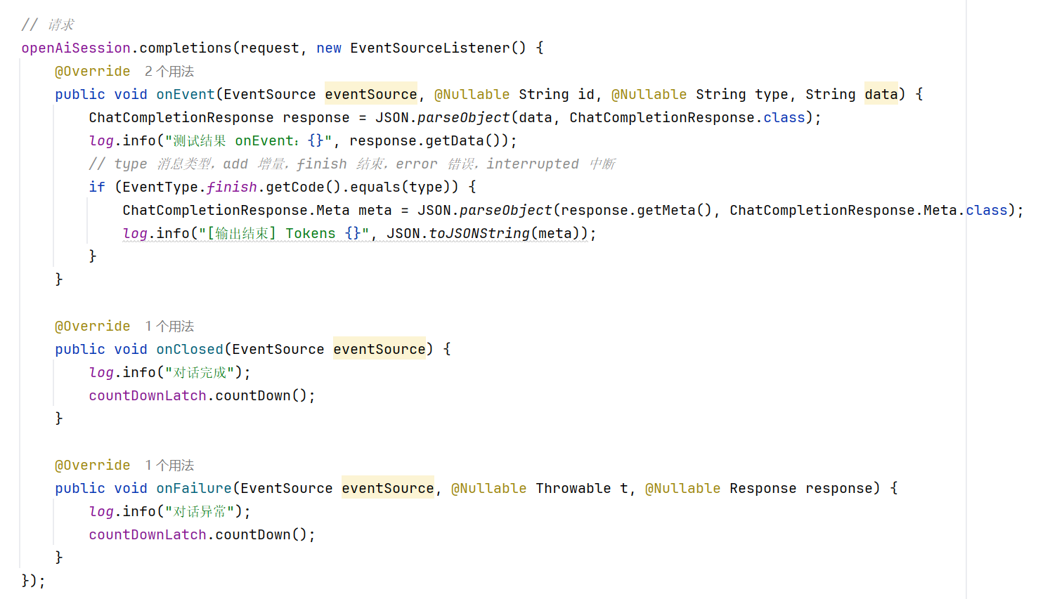 openAiSession.completions(request, new EventSourceListener() {