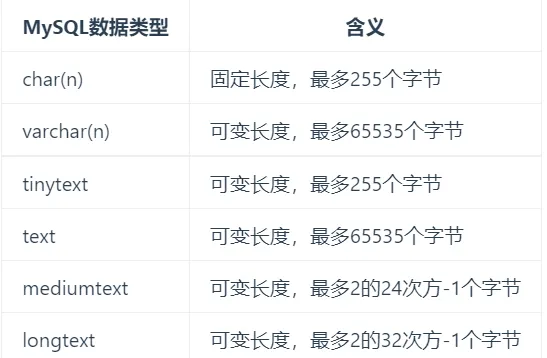 varchar:不定长,效率偏低,内容开头用1到2个字节表示实际长度(长度超过255时需要2个字节),因此最大长度不能超过65535。