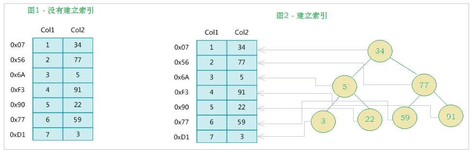 左边是数据表,一共有两列七条记录,最左边的是数据记录的物理地址(注意逻辑上相邻的记录在磁盘上也并不是一定物理相邻的)。为了加快Col2的查找,可以维护一个右边所示的二叉查找树,每个节点分别包含索引键值和一个指向对应数据记录物理地址的指针,这样就可以运用二叉查找快速获取到相应数据。