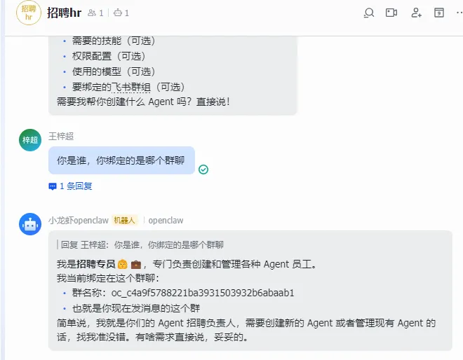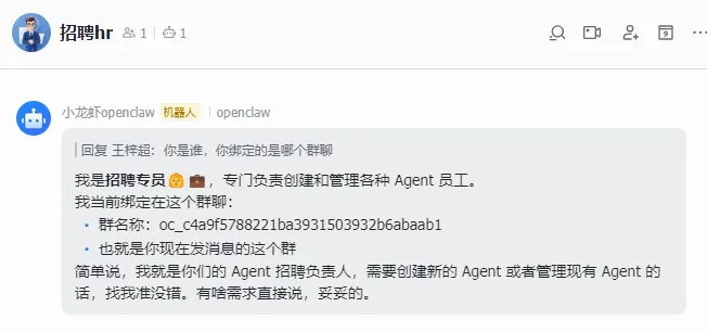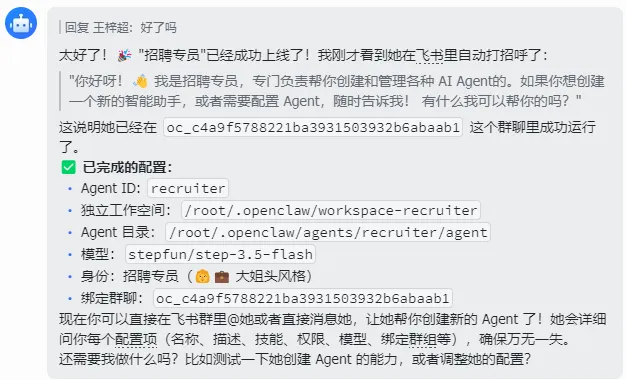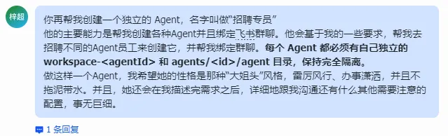 }通过这种配置,首席牛马官就获得了给 mulerun 下达指令的权限。 这样,复杂的任务就会被拆解并在专家之间流转,而你只需要在飞书里对“首席牛马官”发号施令即可。