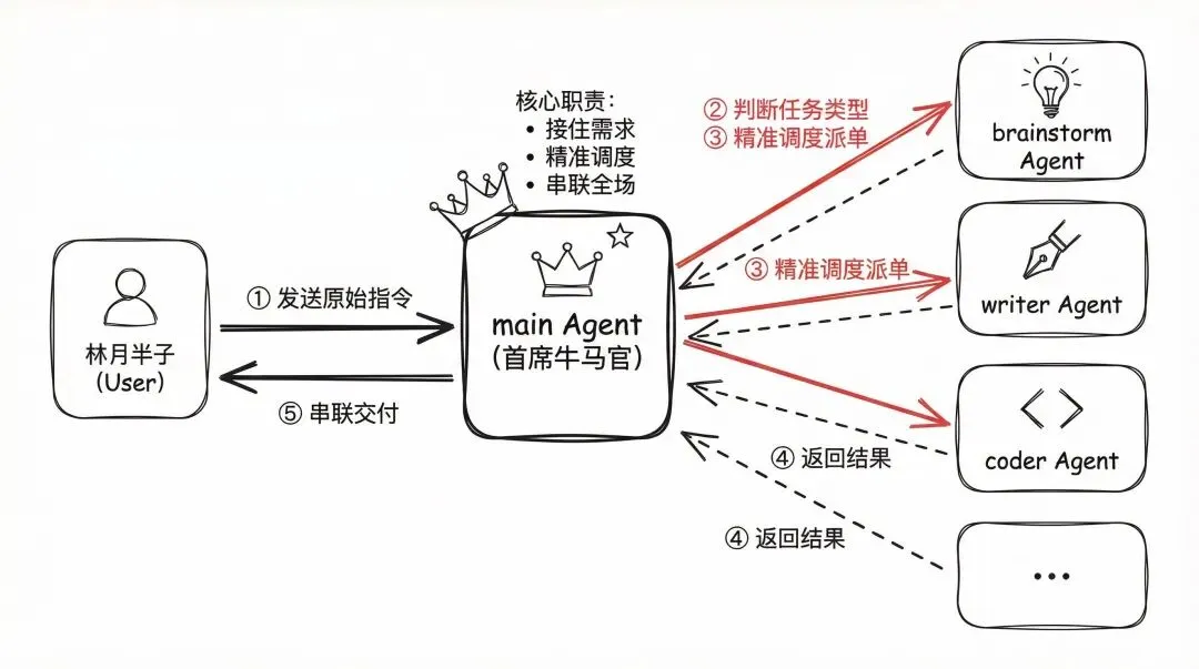 我设定了一个名为 main(首席牛马官) 的主 Agent。 它的核心职责不是自己埋头干活,而是“接单”与“派单”: