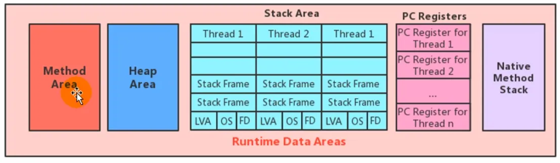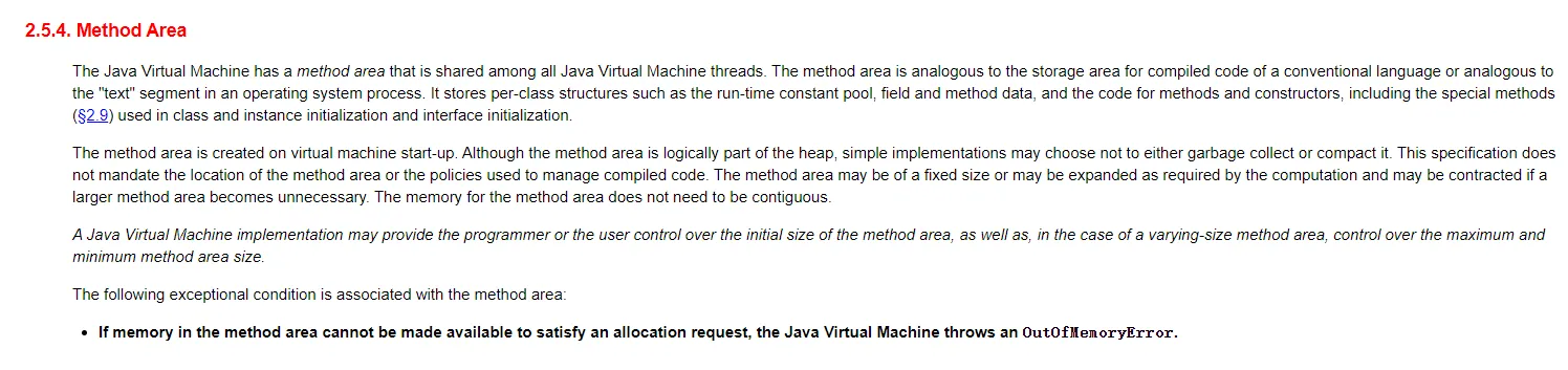 翻译:Java虚拟机有一个在所有Java虚拟机线程之间共享的方法区域。方法区类似于常规语言编译代码的存储区域,或类似于操作系统进程中的“文本”段。它存储类结构,例如运行时常量池、字段和方法数据,以及方法和构造函数的代码,包括类和实例初始化以及接口初始化中使用的特殊方法。