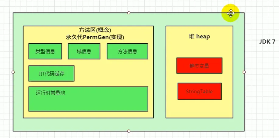 jdk7中将StringTable放到了堆空间中。因为永久代的回收效率很低,在full gc的时候才会触发。而full gc是老年代的空间不足、永久代不足时才会触发。