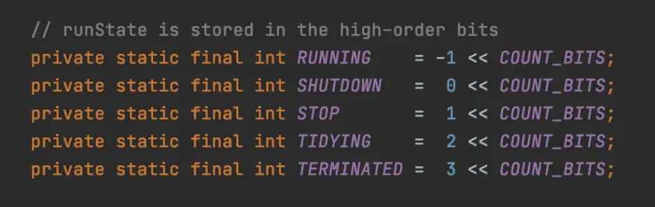 线程池状态具体是存在ctl成员变量中,ctl中不仅存储了线程池的状态还存储了当前线程池中线程数的大小