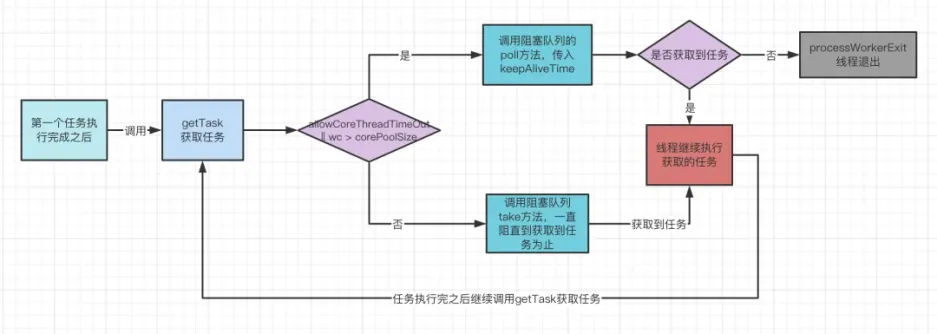 会根据是否允许超时来选择调用阻塞队列workQueue的poll方法或者take方法。如果允许超时,则会调用poll方法,传入keepAliveTime,也就是构造线程池时传入的空闲时间,这个方法的意思就是从队列中阻塞keepAliveTime时间来获取任务,获取不到就会返回null;如果不允许超时,就会调用take方法,这个方法会一直阻塞获取任务,直到从队列中获取到任务位置。从这里可以看到keepAliveTime是如何使用的了。