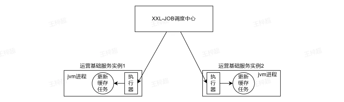 虽然Quartz可以实现按日历调度的方式,但无法支持分布式环境下任务调度。分布式环境下通常一个服务部署多个实例即多个jvm进程,假设运营基础服务部署两个实例每个实例定时执行更新缓存的任务,两个实例就会重复执行。如下图: